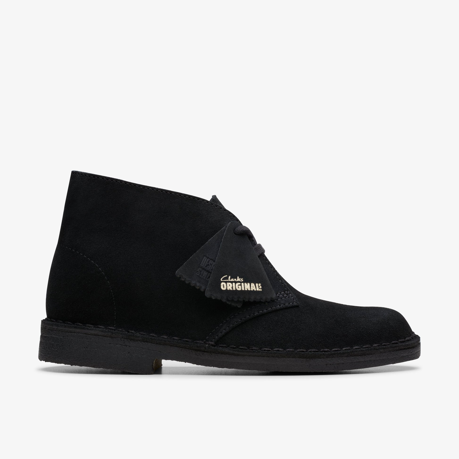 An icon, re-engineered for modern life: introducing the Desert Boot, finished in premium black suede. Remaining true to the authentic, instantly recognisable design of Nathan Clark’s pioneering Desert Boot created in 1950, it delivers enhanced, unrivalled comfort credentials for the effortless all-day wear that 21st-century life demands. A slightly wider last provides a more tailored fit, while the layered OrthoLite® footbed with gait mapping technology offers targeted, breathable cushioning for improved posture and supported steps. Offering optimised grip and durability, the crepe-effect natural rubber sole has an authentic look, which is complemented perfectly by the subtle height and elegant wearability of the innovative hidden heel. The ultimate balance of heritage style with technical evolution ̶ true to the progressive spirit of Clarks.